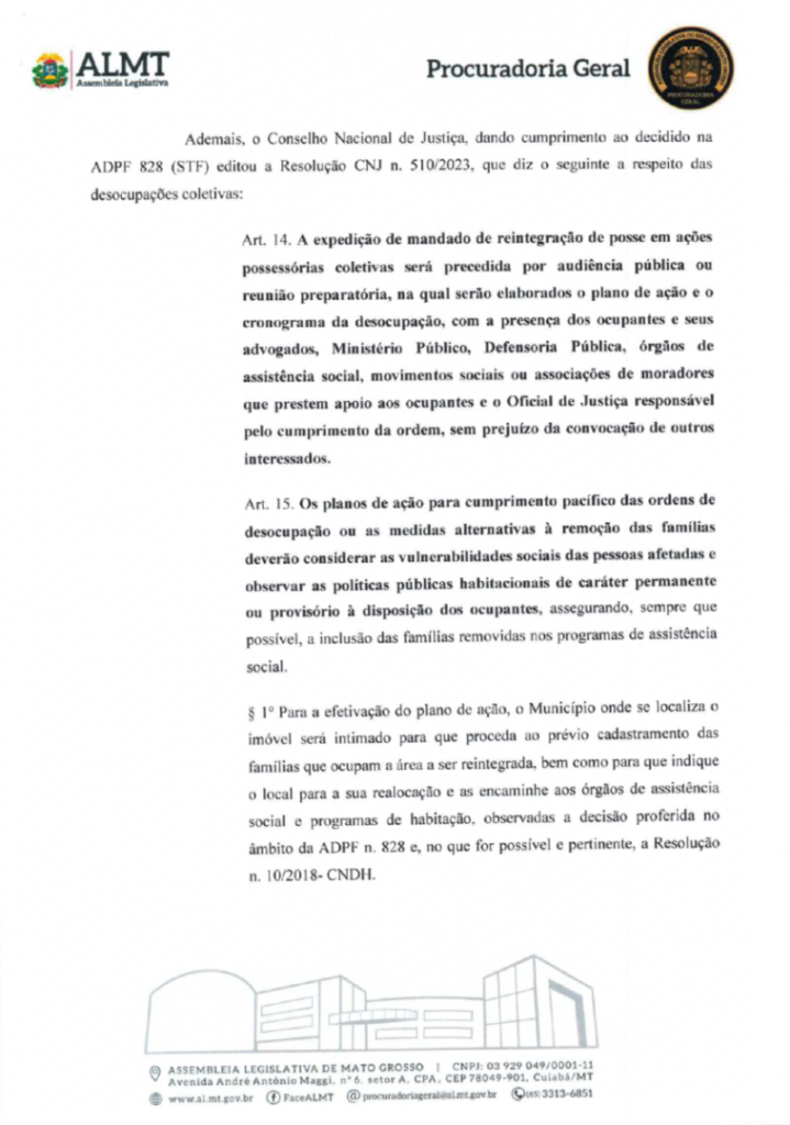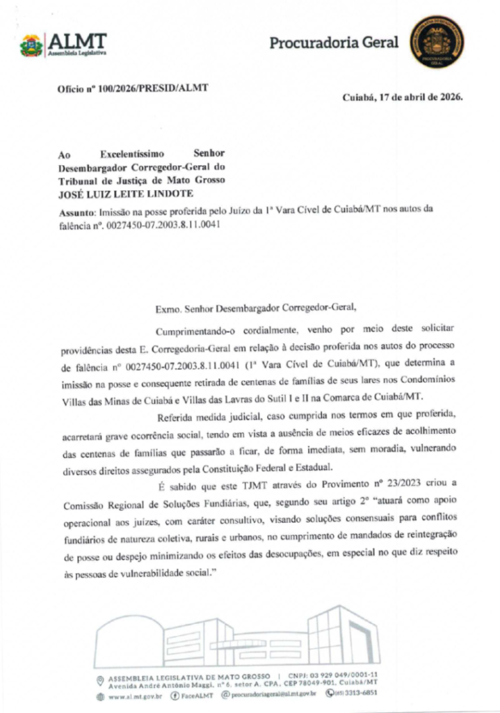 “Buscamos providências para que o cumprimento dos mandados seja suspenso, permitindo uma solução consensual que resguarde o direito constitucional à moradia das famílias vulneráveis”, afirmou o presidente da ALMT.