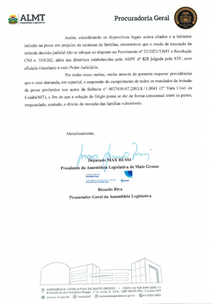 No ofício, Russi argumenta que a ordem de imissão na posse, decorrente de um processo de falência de 2003, desconsidera normas fundamentais de direitos humanos e mediação de conflitos. Segundo o parlamentar, a execução da decisão não respeita o Provimento nº 23/2023 do TJMT, a Resolução 510 do CNJ e as diretrizes do STF (ADPF 828), que exigem que as desocupações coletivas sejam precedidas de diálogo e planos de acolhimento social.